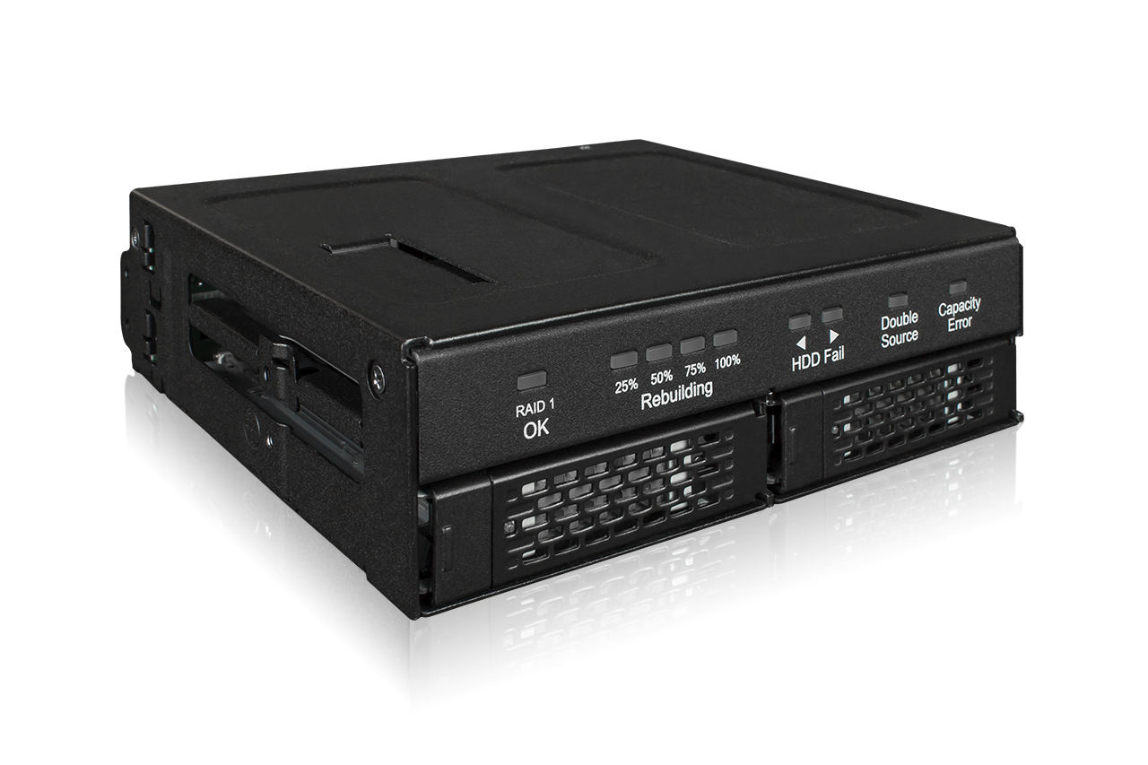 | 製品名: | ハードウェアRAID1 リムーバブルケース 2つの 15mm 厚のHDD/SSD を 1つの 5.25インチベイ に搭載 |
