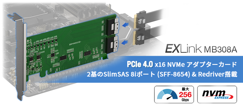 • | 2 × SlimSAS 8i (SFF-8654) ポート搭載、SFF-9402 Rev 1.1準拠 |
