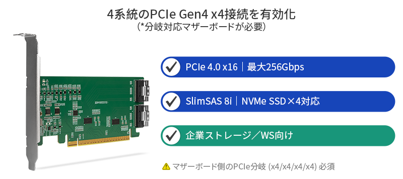 • | 4台のSSD利用にはマザーボード側のPCIe分岐 (x4/x4/x4/x4) 必須 (カード自体は分岐機能なし) |