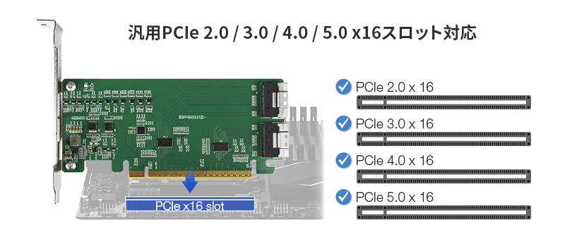 対応スロット: | ザーボード上の x16 PCIe 2.0/3.0/4.0/5.0 スロットに対応 (マザーボードは x16 スロットを x4/x4/x4/x4 に分岐できる必要があります) |