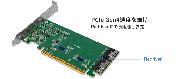• | Redriver IC内蔵で長距離伝送時もGen4信号を保持 |
