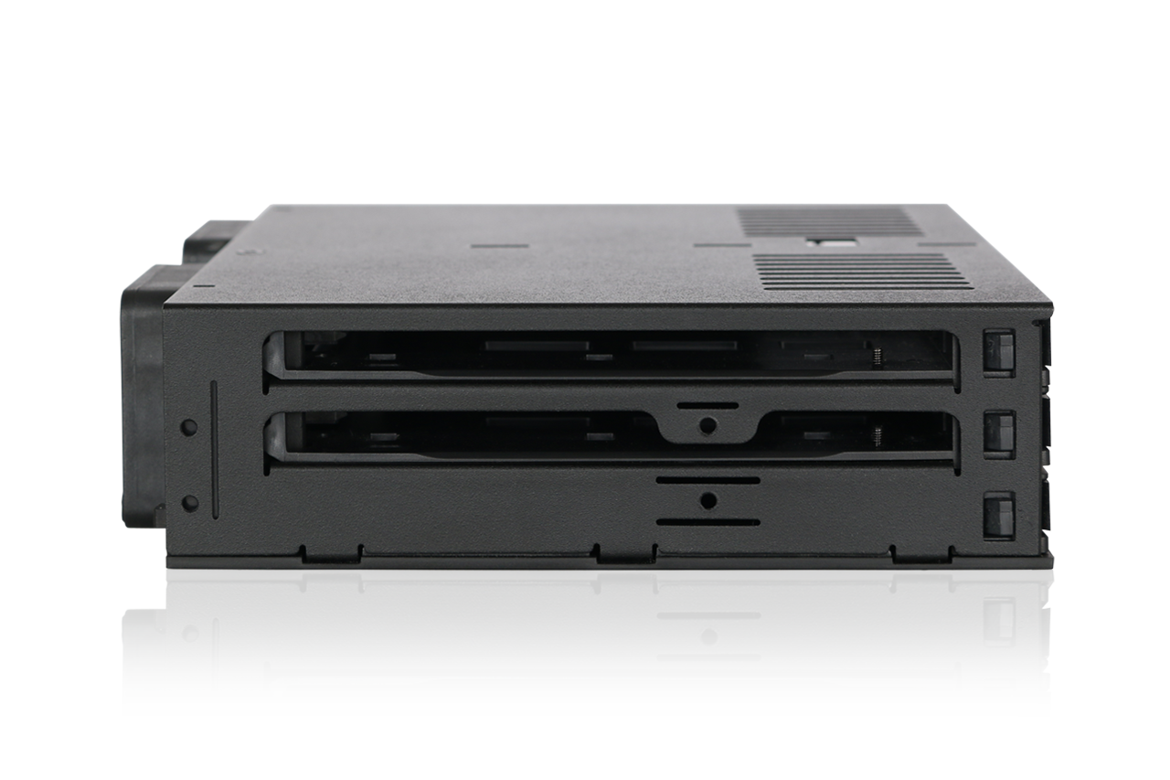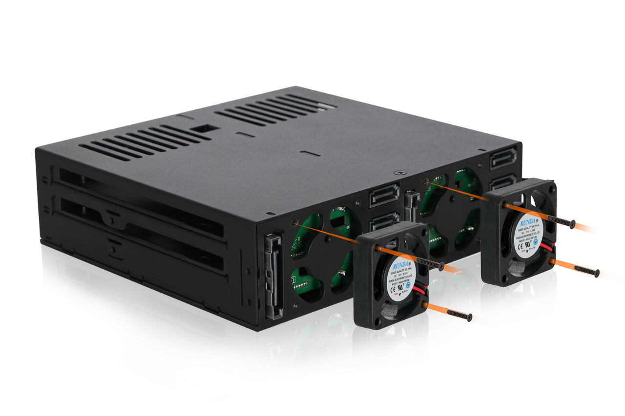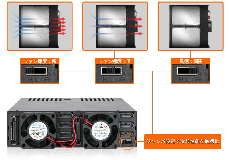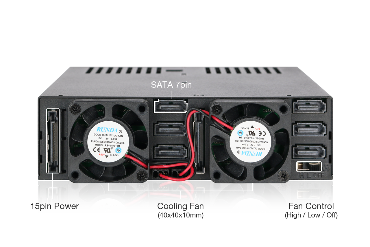 6 台のドライブが発生させる熱に対応するため、MB326SP-1B は背面に配置されたデュアル 40mm 冷却ファンと、シャーシおよびトレイ周辺の通気孔によって効率的な冷却性能を提供します。ユーザーはスイッチスライダーを使って、以下の 3 種類のファンモードを選択できます: