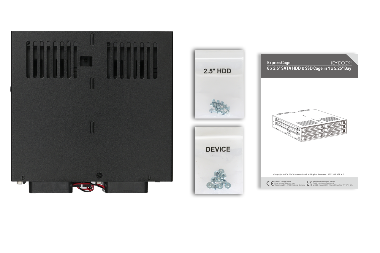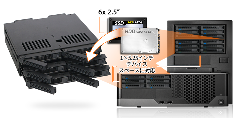 | • | 単一の 5.25" ベイに最大 6 台の 2.5" SATA/SAS HDD または SSD を搭載可能 |