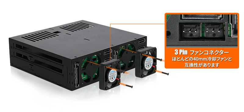 A: 当社が採用している冷却ファンは、エンクロージャとの互換性と安定動作を確認するために徹底的なテストを行っており(一部モデルではファン速度制御にも対応)、最良の結果を得るためには純正ファンの使用を推奨しています。ただし、使用環境によっては純正ファンが適さない場合があるため、サードパーティ製ファンを使用しても保証は継続されます。ただし、サードパーティ製ファンが原因で電気的損傷が発生した場合は、保証対象外となる可能性があります。
