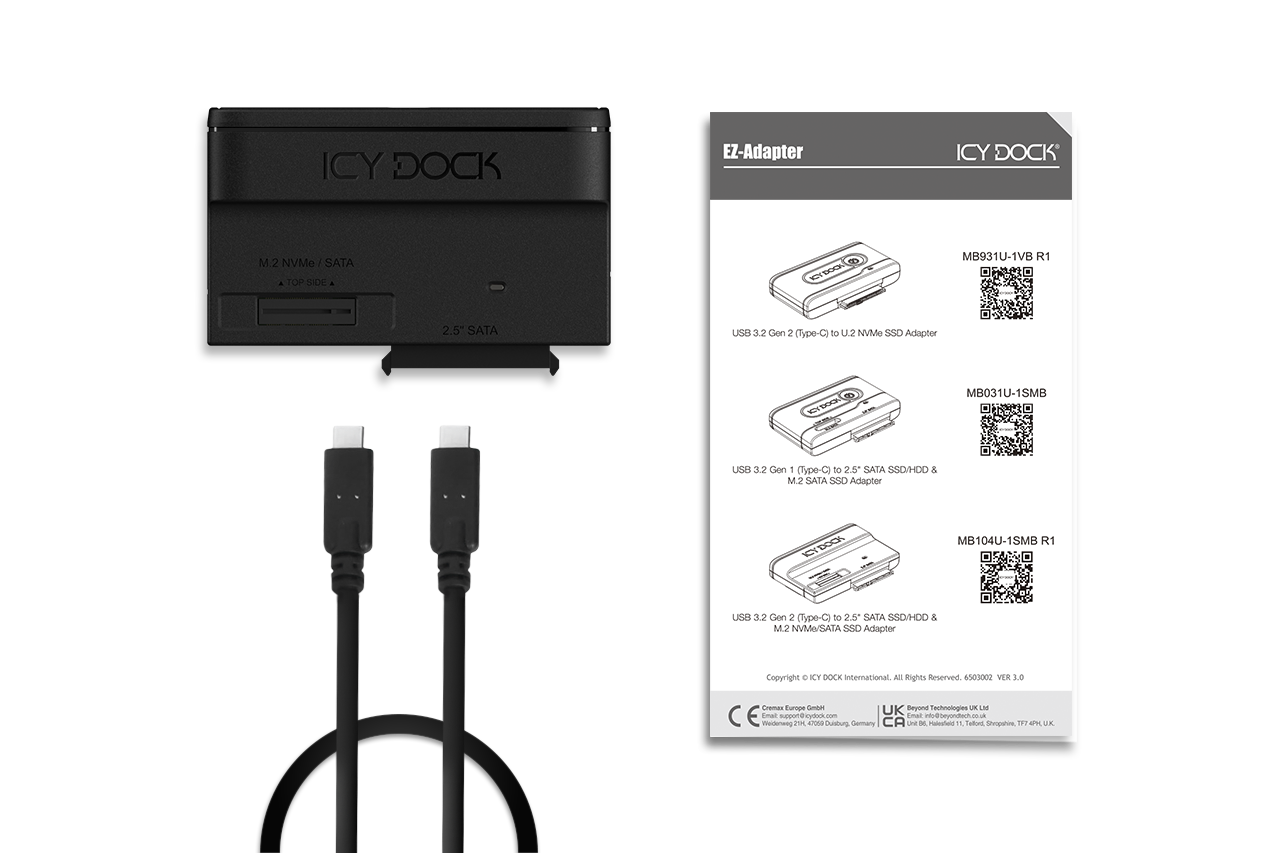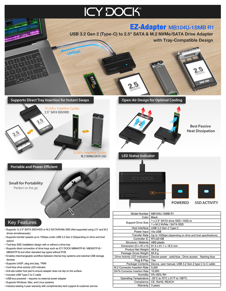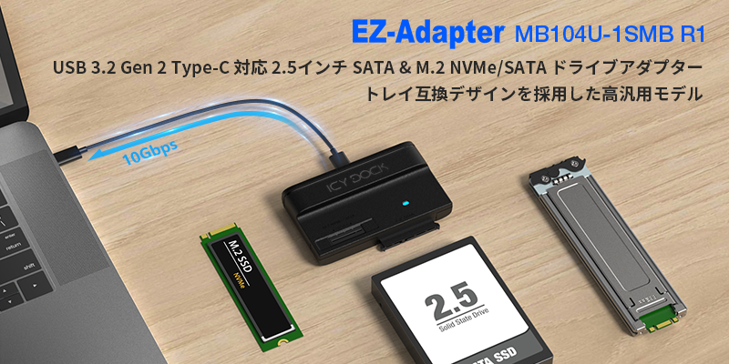 MB104U-1SMB R1 は以下の ICY DOCK トレイと完全互換です: MB840M2P-B, MB840M5P-B, MB842MP-B, MB842M5P-B, MB852M2PO-B, MB872MP-B, MB873MP-Bなど。 ワークステーションやサーバーから取り外した SSD を、 そのまま USB で即アクセス可能。テスト、バックアップ、システム保守作業が劇的に効率化します。