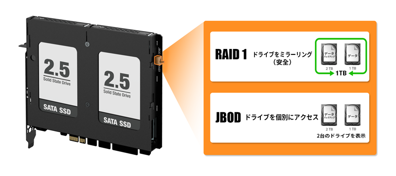 | 対応ドライブ: | 2 × 2.5インチ SATA SSD/HDD |