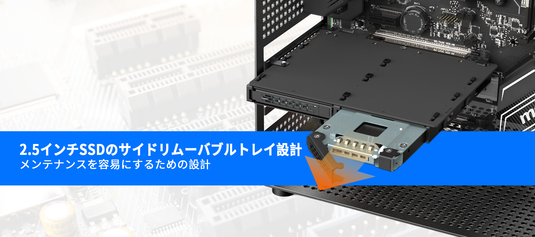 サイドプル式リムーバブルトレイ設計により、PCIeスロットの有効活用とドライブアクセスの簡易化を実現