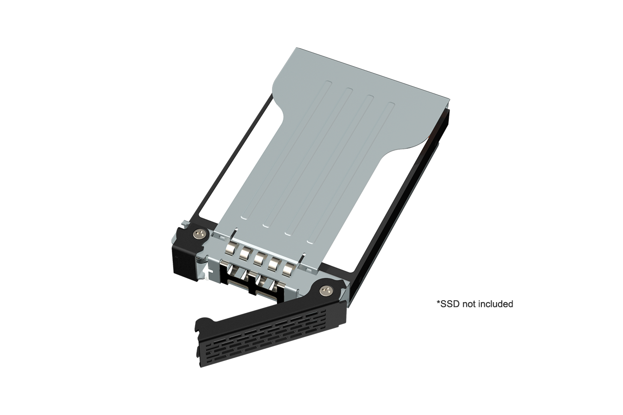 A: ドライブトレイをエンクロージャから一度取り外し、トレイ前面の金属メッシュ部分に過度な力を加えずに再度挿入してください。前面の金属メッシュに強い力を加えると、上下の金属スプリングが曲がり、トレイの挿入が困難になる場合があります。このような状態では無理にトレイを挿入せず、金属スプリングの損傷を防いでください。