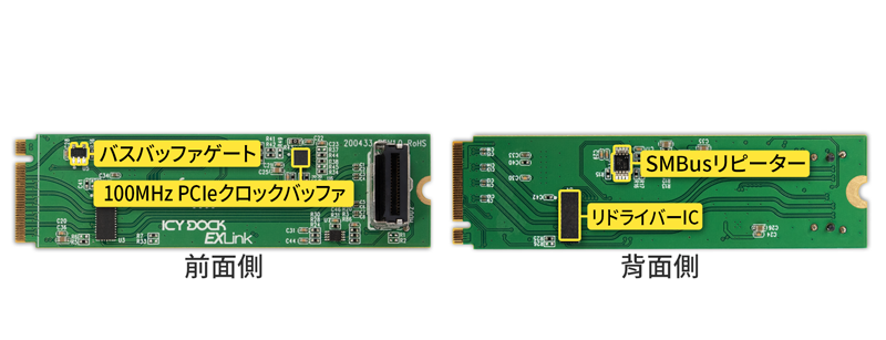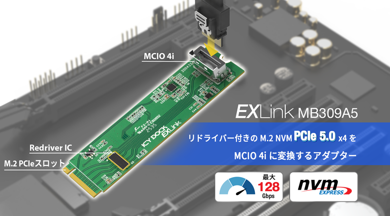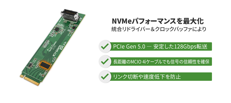 | • | PCIe Gen5 Redriver を内蔵し、長距離ケーブル環境でも高速信号の完全性を確保 |