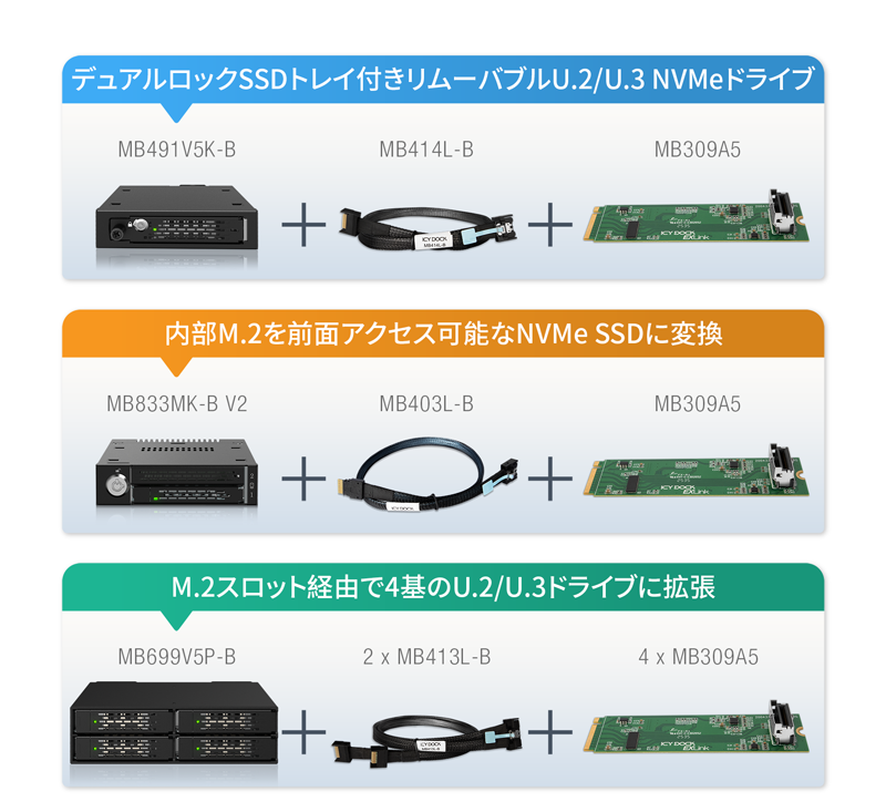 MB309A5 は ICY DOCK の EXLink エコシステムにおける中核製品であり、リムーバブル NVMe SSD ソリューションの導入を容易にするために設計されています。単一の M.2 スロットのアップグレードから、フロントアクセス型 U.2 構成、デュアルドライブ構成まで、MB309A5 は ICY DOCK のリムーバブルストレージモジュールおよび MCIO ケーブルとシームレスに連携し、ターンキーで導入可能な構成を提供します。