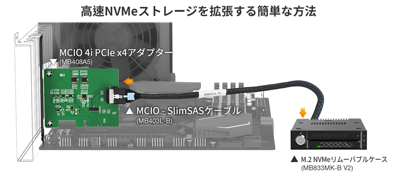 | • | サーバー、ワークステーション、MCIO ベースの NVMe ストレージソリューションに最適 |