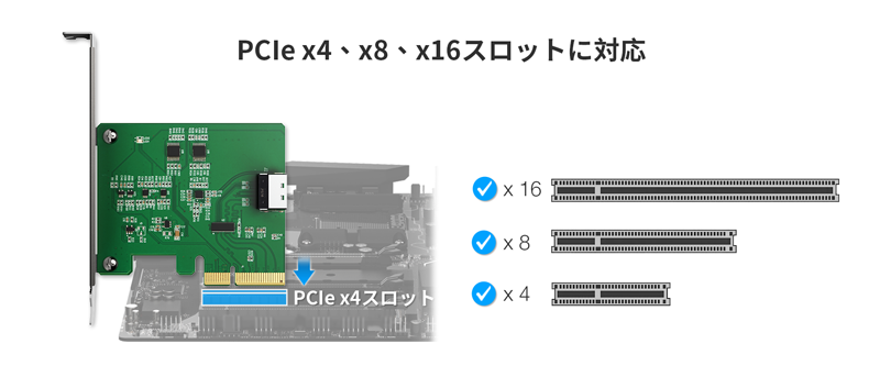 | • | PCIe 2.0 / 3.0 / 4.0 / 5.0 スロット対応(物理 x4 / x8 / x16) |
