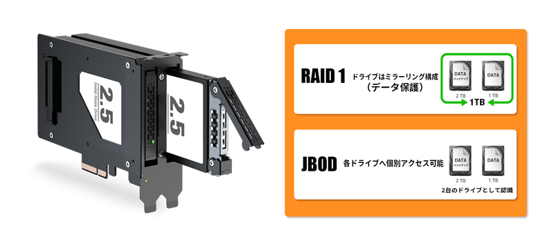 | • | データ保護または柔軟なストレージ構成を実現する PCIe RAID 1 / JBOD 内蔵対応 |