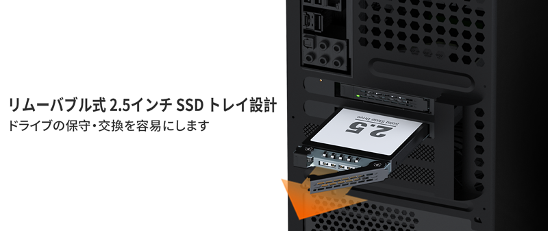 | • | 2 × 2.5インチ SATA SSD/HDD に対応(最大高さ 9.5mm) |