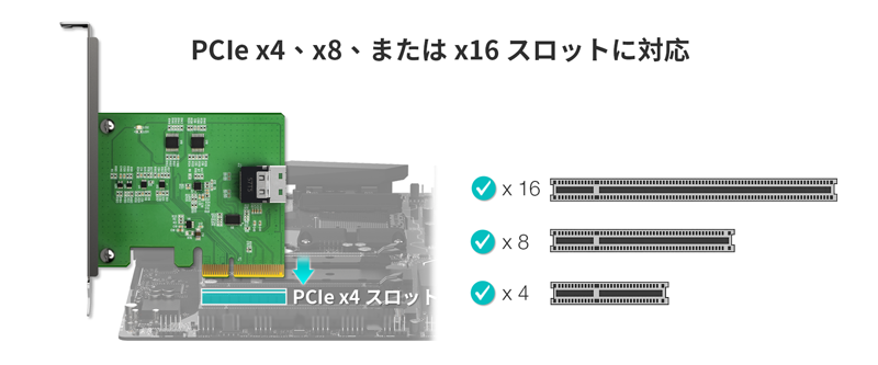 | • | PCIe 2.0 / 3.0 / 4.0 / 5.0スロットに対応(x4物理インターフェース) |