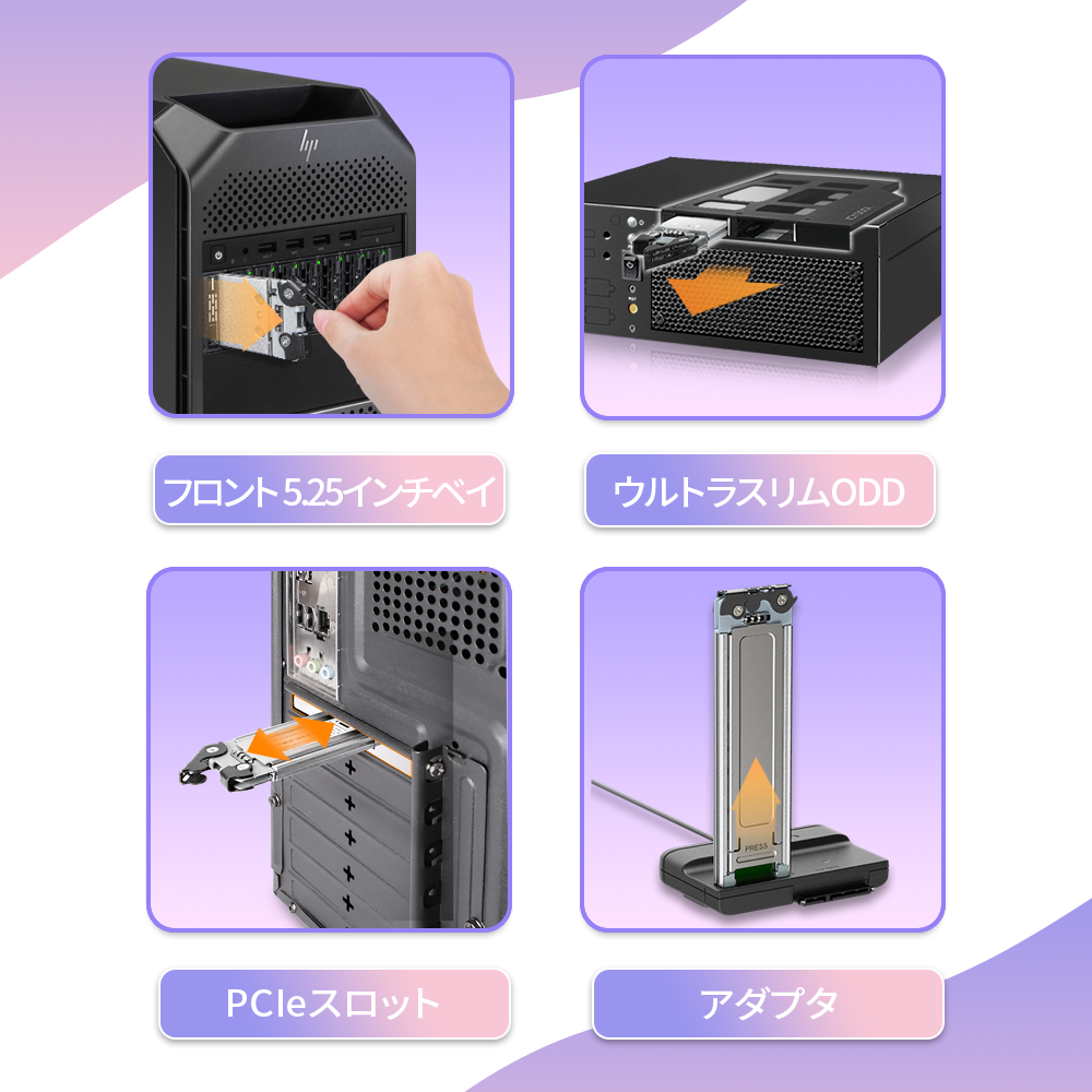 このトレイは、PCIeスロット、ウルトラスリム光ディスクドライブ(ODD)、およびフロント5.25インチベイなど、さまざまなフォームファクタで設計された当社の各種リムーバブルドライブストレージエンクロージャーと互換性があり、相互に交換可能です。 |