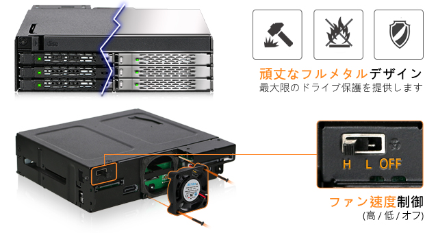 | ToughArmorの名前は、頑丈な軍事用途に適していることで知られており、この傾向はToughArmor ODD + SSD搭載用リムーバブルケースでも続いています。 頑丈なフルメタルシャーシは衝撃による損傷から保護し、アクティブな冷却システムと連携してできるだけ多くの熱を取り除き、高負荷下でも過熱による損傷を防ぎます。 |
